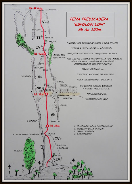 El Espolón Lon es una bonita vía de 147 metros y grado 6b con un paso de Ae en el comienzo del tercer largo, situada en la estrecha canal que divide la pared de la Predicadera en dos partes. Abierta por Ignacio Aparicio y José Maria (Boxi) en el año 1992, recientemente ha sido reequipada con parabolt de métrica 12 y reuniones de anillas excepto la ultima reunión que es sin anillas.